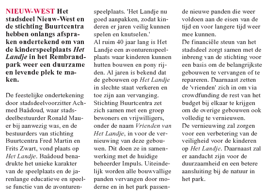 Voor de vernieuwing van het Landje hebben Stadsdeel Nieuw-West en Stichting Buurtcentra op 25 februari 2016 een samenwerkingsovereenkomst getekend. Buurtcentra zal de komende tien jaar een aantal gebouwen op het landje vervangen en deze onderhouden.