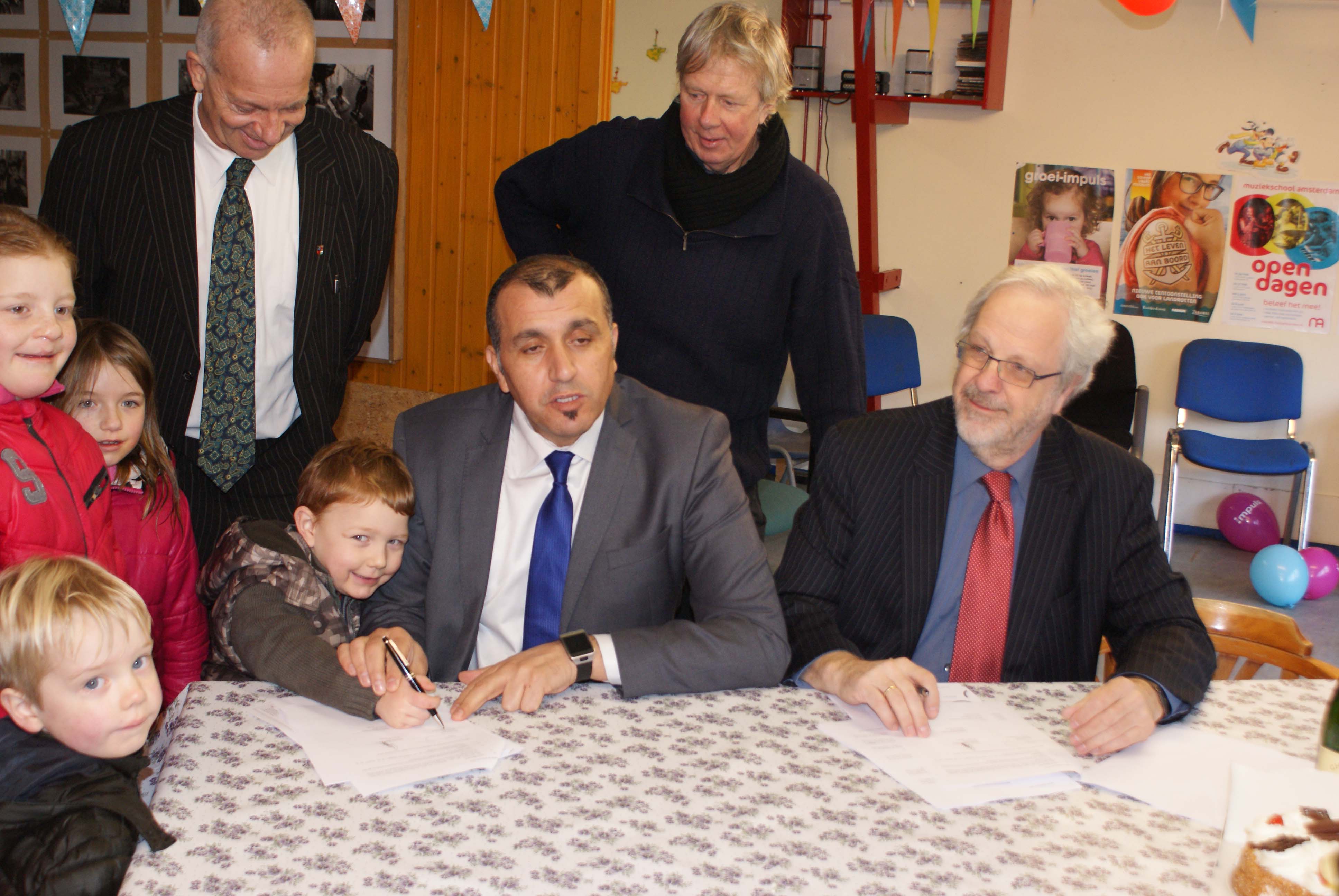 Zittend stadsdeelvoorzitter Achmed Baadoud (links) en Buurtcentra-bestuurder Fred Martin. Op de achtergrond stadsdeel DB-lid Ronald Mauer (links) en beheerder Landje Piet de Bake.